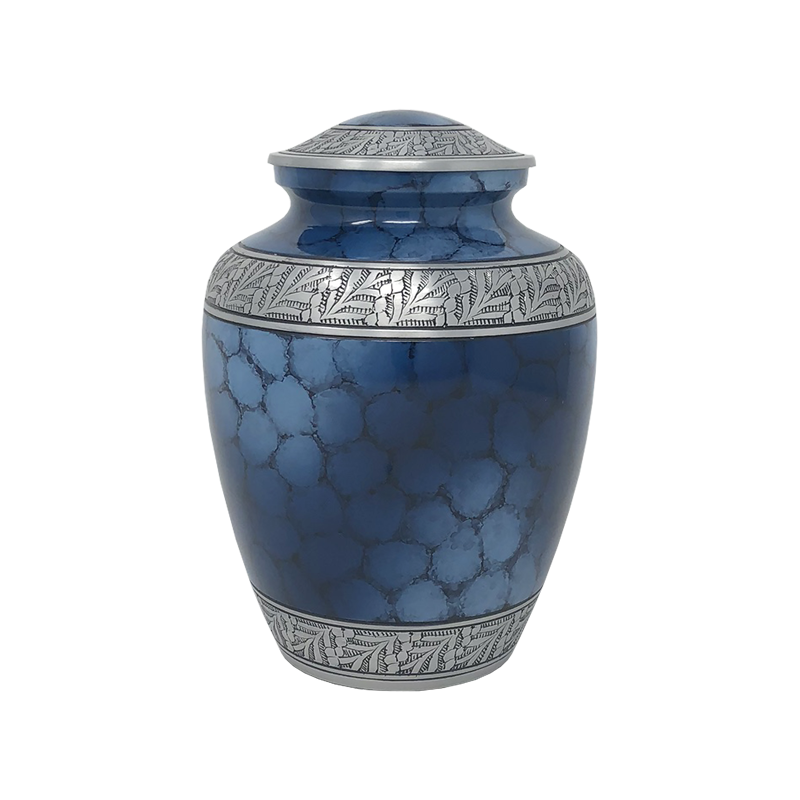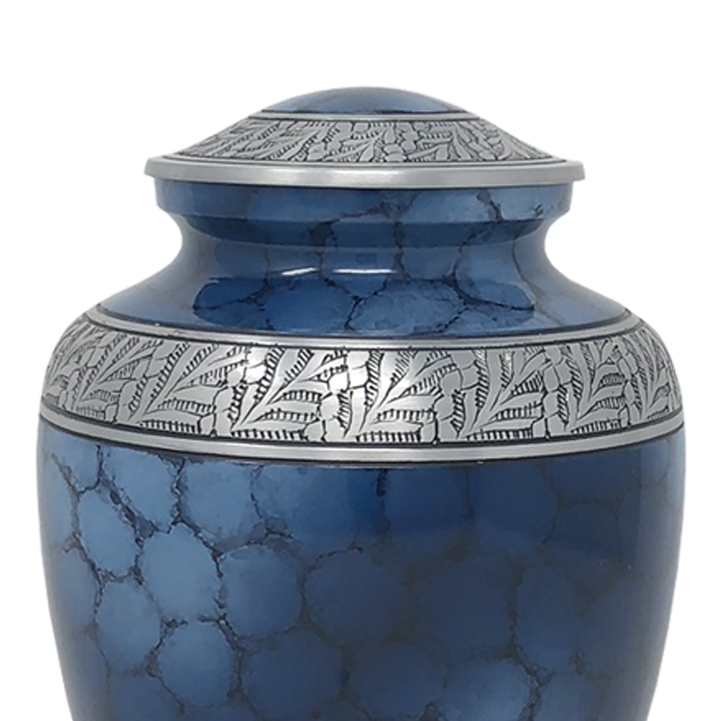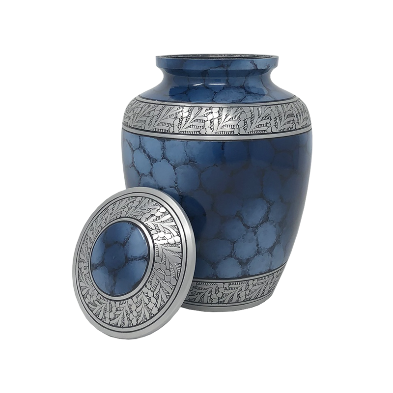 - The Blue Cloud urn by Momentful Life has a modern yet stately styling. This urn dark and light blue shading over a hand painted cloud pattern. It also features a hand etched silver inlay on the bottom, top and lid.