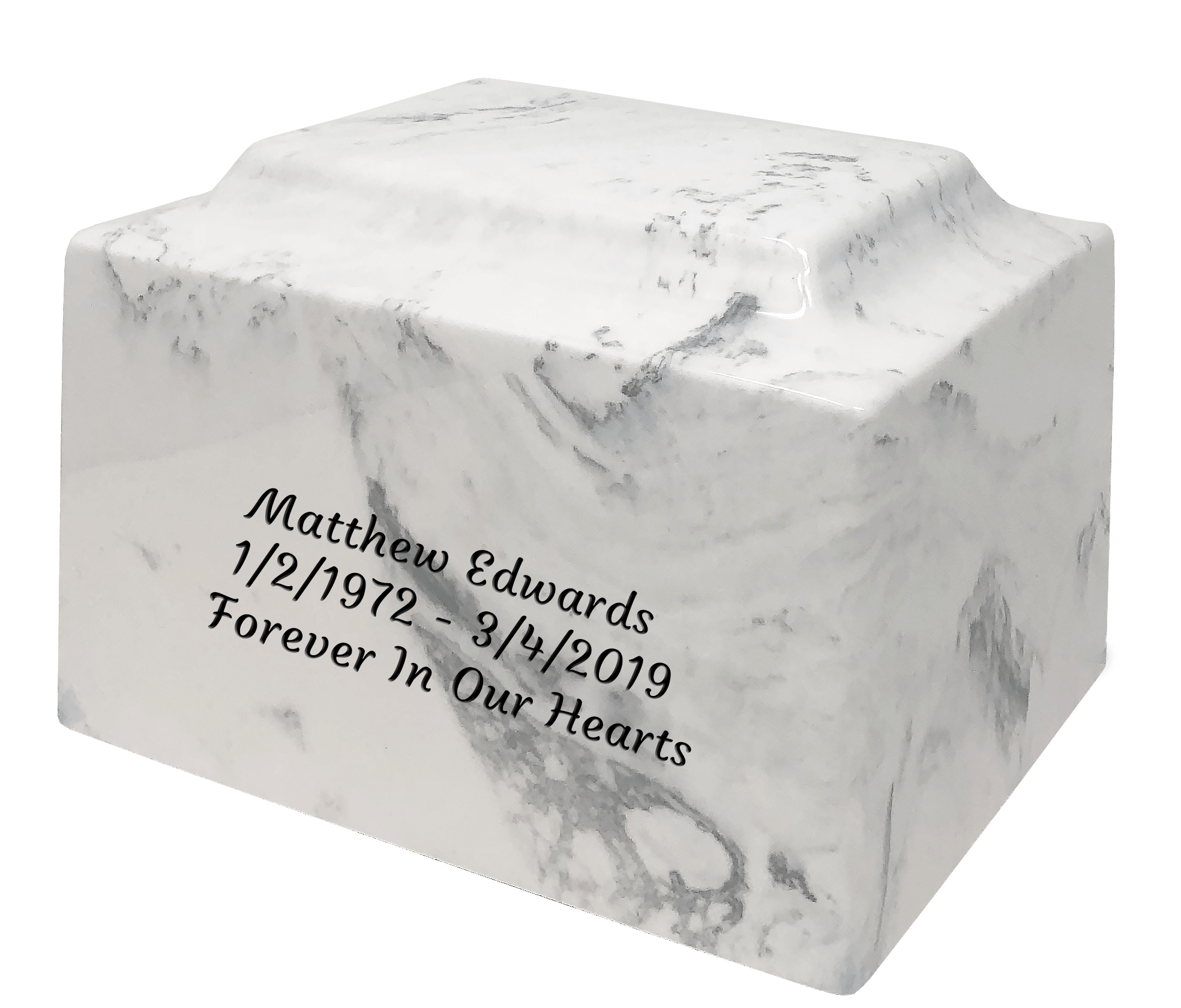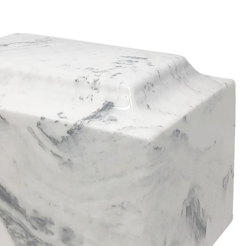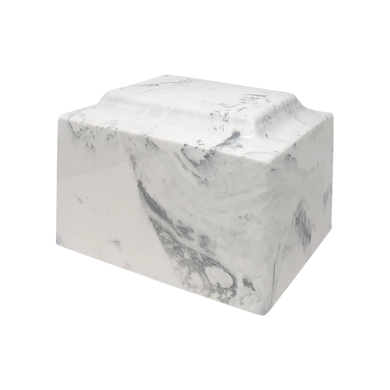 - This modern cultured marble urn has a more substantial, detailed profile and is a white in color with hints of black and gray veins, making it a stately choice your loved one.