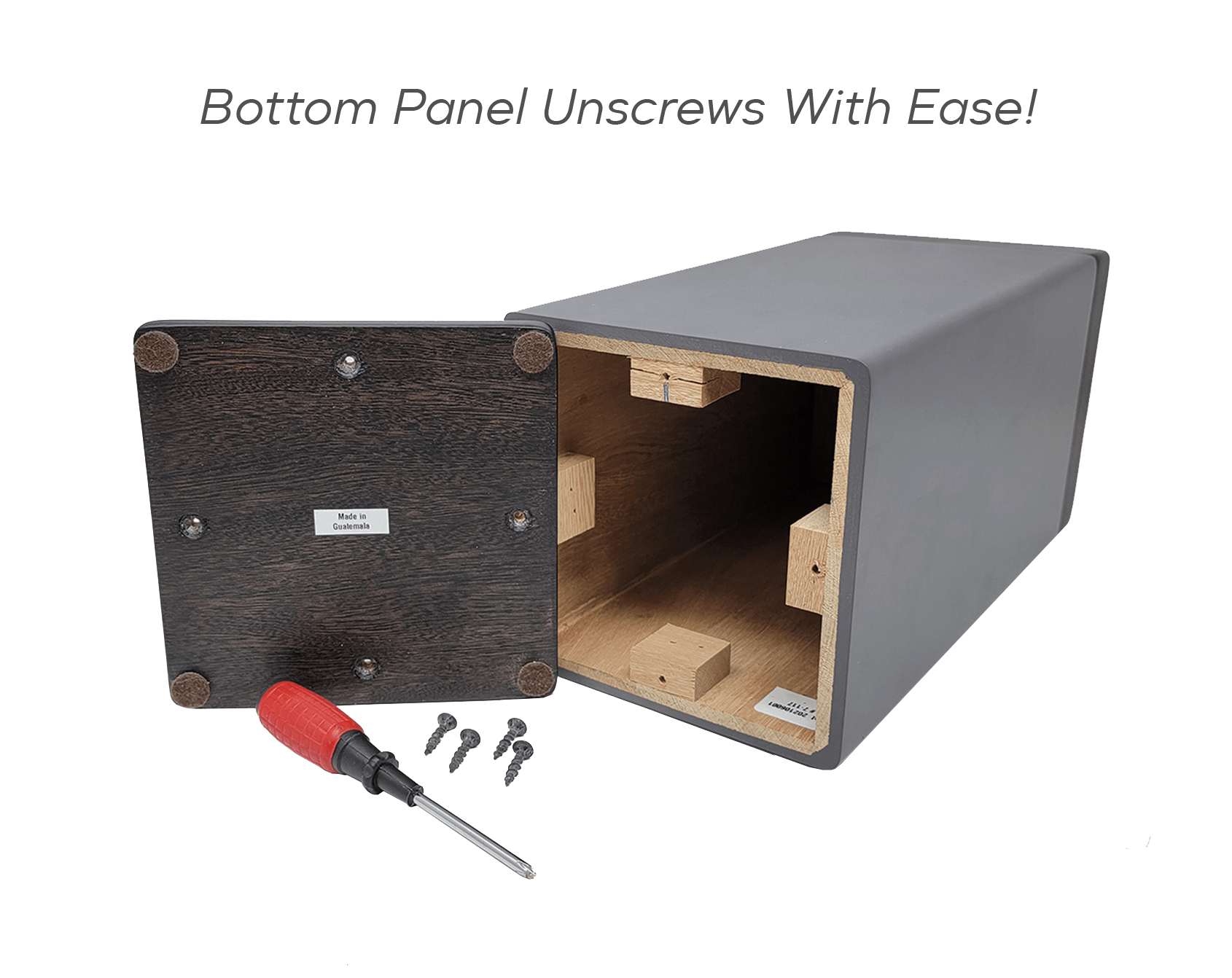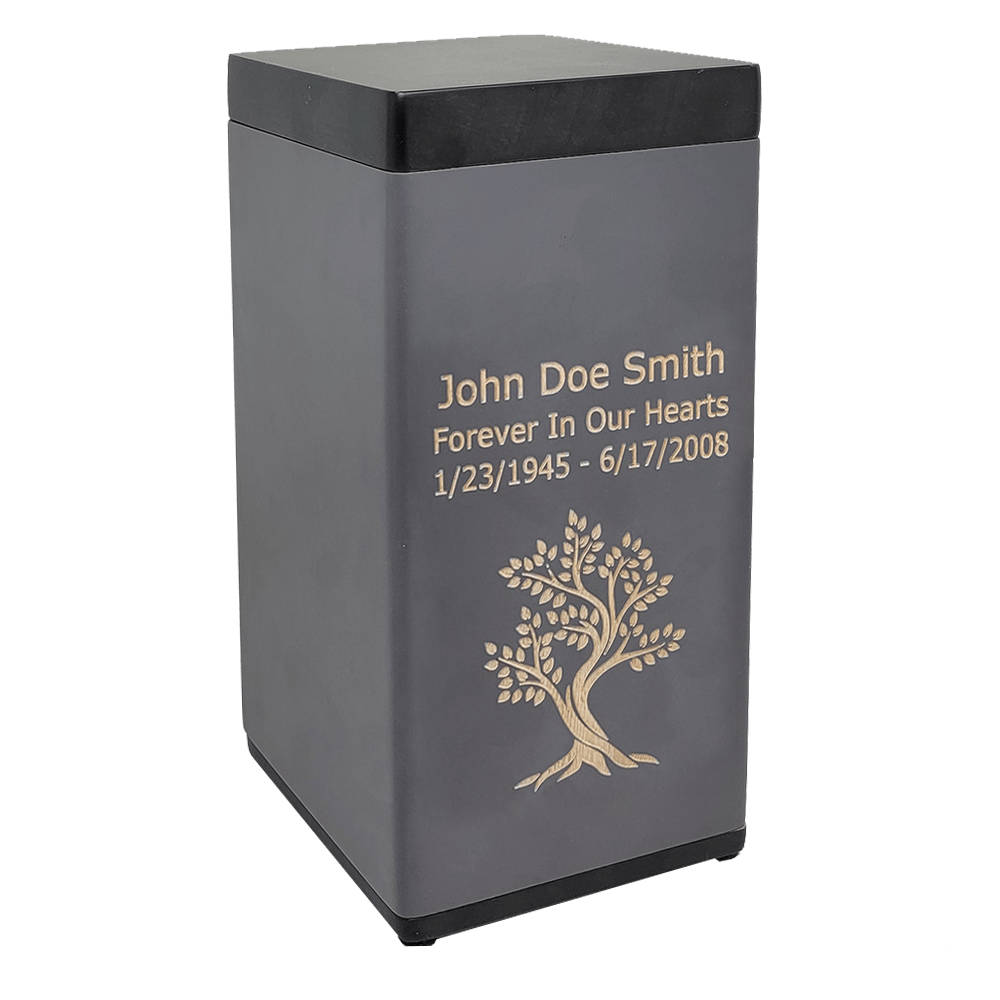 - HAVEN SLATE WOODEN URN: The Haven Slate Gray Wooden Cremation Urn stands out due to its contemporary look and solid feel. The exterior features a smooth slate grey painted finish and black stained wood on the top and bottom of this urn. Made from 100% solid wood, the Slate Gray Wooden Cremation Urn is sure to create a beautiful tribute for your loved one and will last for generations to come. This is an adult size urn.