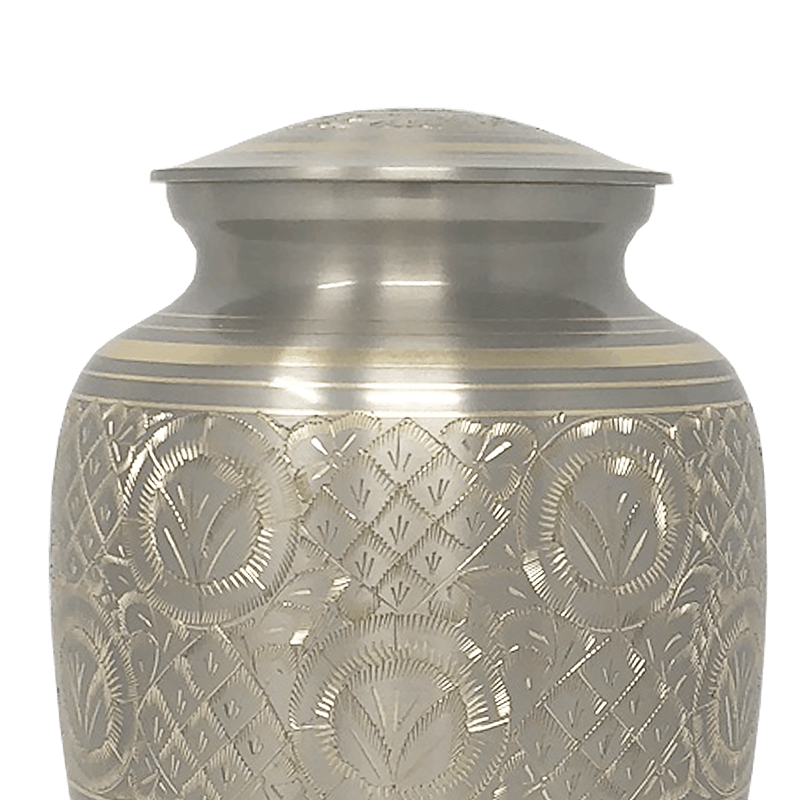 - The Platinum urn by Momentful Life is ornately engraved. This brass urn has a brushed silver, satin finish detailed gold engravings on the entire body and lid of the urn.