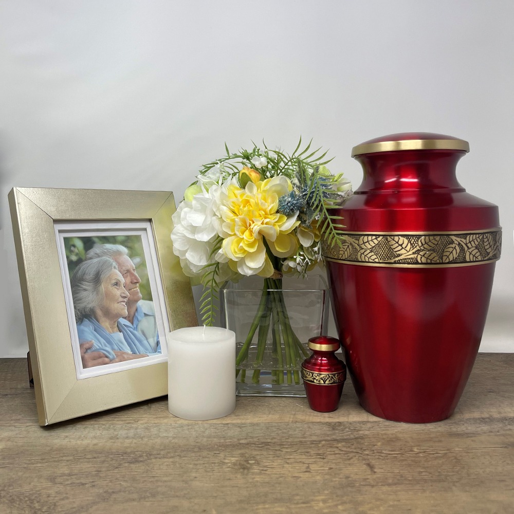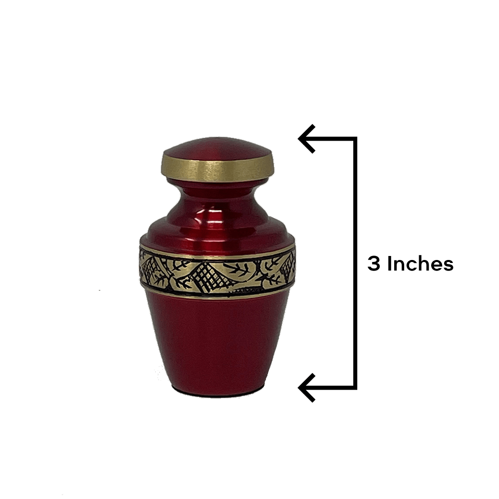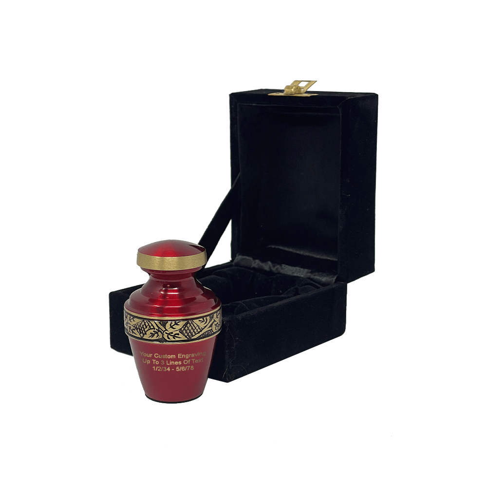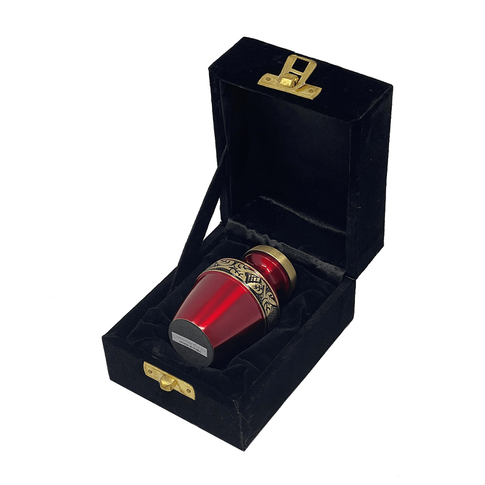 - The Revere Crimson Red Keepsake Urn by Momentful Life has the same modern detailed styling as it's full-size counterpart. The urn has a vibrant red finish with a gold hand-engraved band on the body of the urn and the lid.